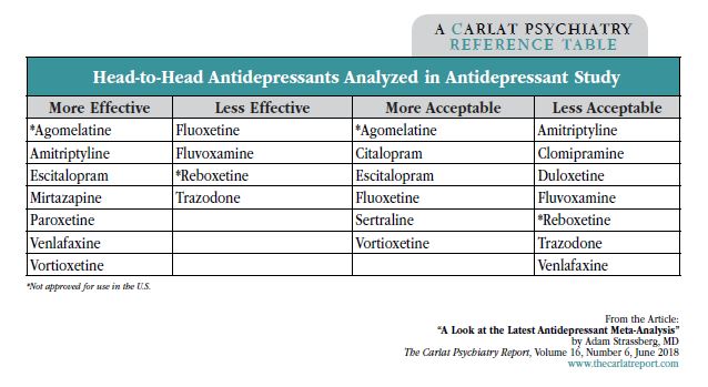 All antidepressants were more effective than placebo, with odds ratios (OR) ranging from 2.13 for amitriptyline to 1.37 for reboxetine (a norepinephrine reuptake inhibitor not approved in the US). For acceptability, only agomelatine (an atypical agent not approved in the US, OR 0.84) and fluoxetine (OR 0.88) were associated with fewer dropouts than placebo, while clomipramine was associated with more dropouts than placebo (OR 1.30).