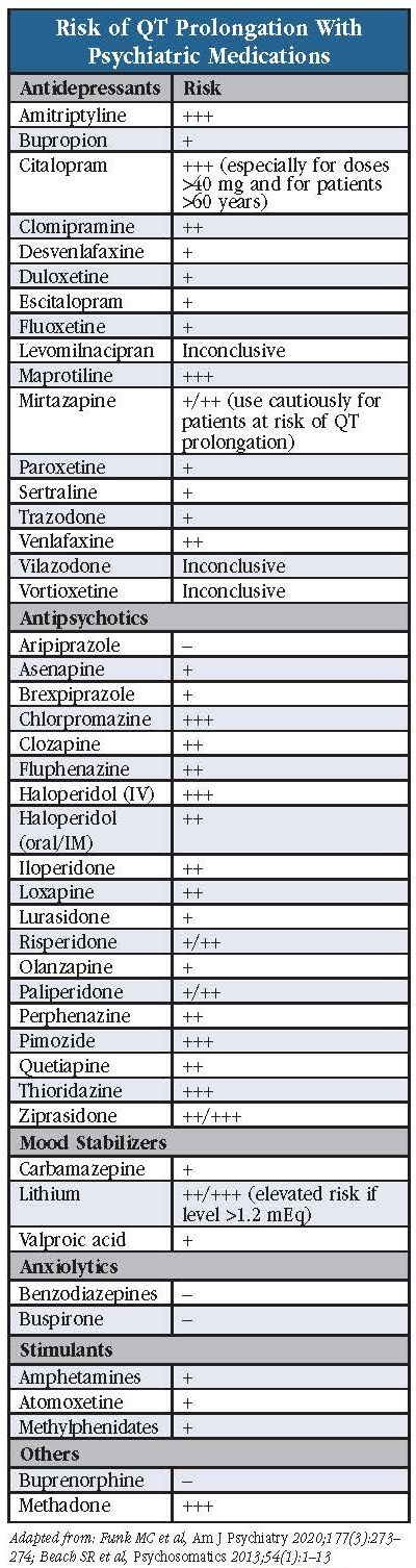 Among psychiatric meds, thioridazine, chlorpromazine, ziprasidone, pimozide, methadone, IV haloperidol, citalopram (>40 mg/day), and tricyclic antidepressants produce the most worrisome QT prolongation. In overdose, many additional medications have the potential to prolong the QT interval.