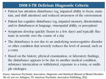 “Delirium” describes an acute change from baseline mental status marked by inattention, disorientation, and thought disorganization (see “DSM-5 Delirium Diagnostic Criteria” box). Symptoms fluctuate over the course of a day, and patients often appear fully lucid for brief periods. Their sleep-wake cycles are disturbed, and they may demonstrate a broad range of emotions or experience hallucinations (Inouye SK, N Engl J Med 2006;354(11):1157–1165). Other terms often used to describe delirium include encephalopathy, altered mental status, and acute confusional state. However, these terms are not considered synonymous, and the term delirium is preferred when referring to clinical features observed at the bedside (Slooter AJC et al, Intensive Care Med 2020;46(5):1020–1022).