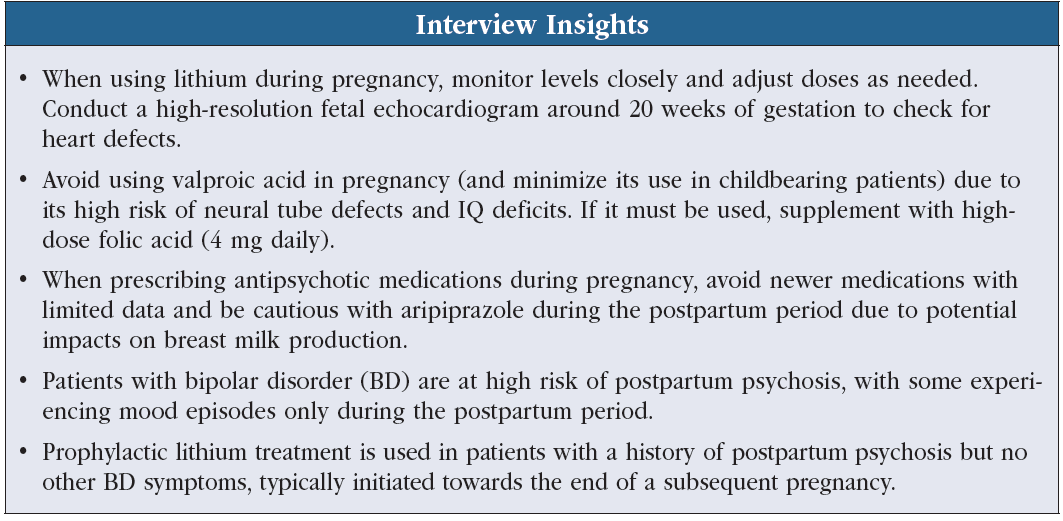 Dr. Osborne: Yes, I do. We know that patients with postpartum psychosis are unusually responsive to lithium. A study found that lithium led to complete remission in over 98% of the patients with postpartum psychosis (Bergink V et al, Am J Psychiatry 2015;172(2):115–123). So, if I have a patient with postpartum psychosis and no prior psychiatric history, I will usually treat them with lithium for nine months to a year after the episode of postpartum psychosis and then gradually taper down the medication. If the patient does not self-declare as having BD before the next pregnancy, I watch them very carefully during pregnancy and then start lithium prophylactically toward the end of pregnancy, around 32-36 weeks of gestation. Sometimes I’ll wait until after delivery, but that’s tricky because postpartum psychosis can present within days, and you want the lithium to be up to a steady-state level.