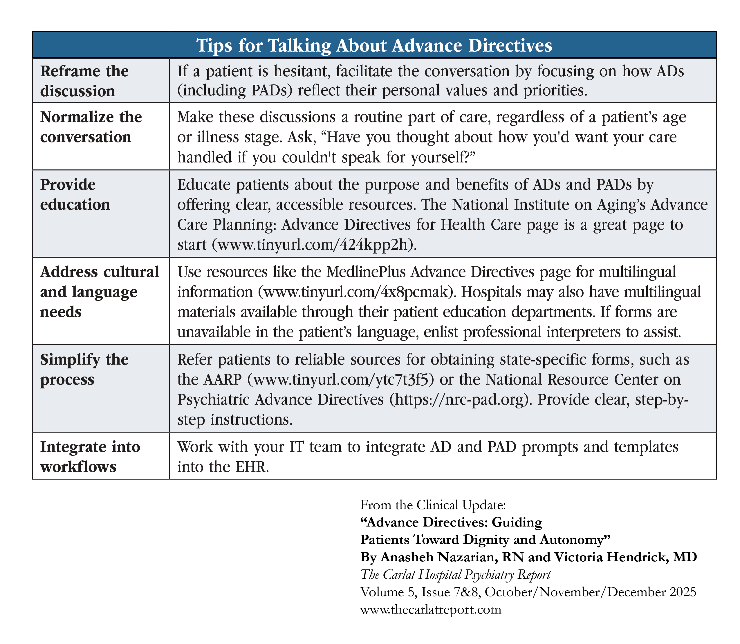 Despite the importance of ADs, fewer than one-third of adults in the US have completed one (Yadav KN et al, Health Affairs 2017;36(7):1244–1251). Some feel uncomfortable talking about future health scenarios, while others equate ADs with “giving up.” Cultural or religious beliefs, limited health literacy, and lack of awareness also pose challenges. Systemic factors, such as time constraints during appointments and inconsistent EHR integration, further contribute to low completion rates. Psychiatrists can play a key role in overcoming these barriers, particularly by reframing ADs as tools for maintaining autonomy rather than surrendering control.
