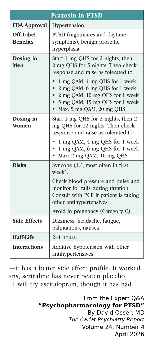 Dr. Osser: Negative studies are common in psychiatry, but prazosin is still positive in meta-analyses and systematic reviews that included that study, and it’s now backed by seven trials with large effect sizes, including civilian and military PTSD (Lappas AS et al, Sleep Med 2024;119:467–479; Mendes TP et al, Prog Neuropsychopharmacol Biol Psychiatry 2025;136:111253; Guo P et al, Acta Psychiatr Scand 2025;151(2):142–151). The study you mention may have been negative because it enrolled patients who were less likely to respond to prazosin. They had normal blood pressure (which predicts poor response), and they recruited from centers that were already using a lot of prazosin, so the best responders were not going to enroll.