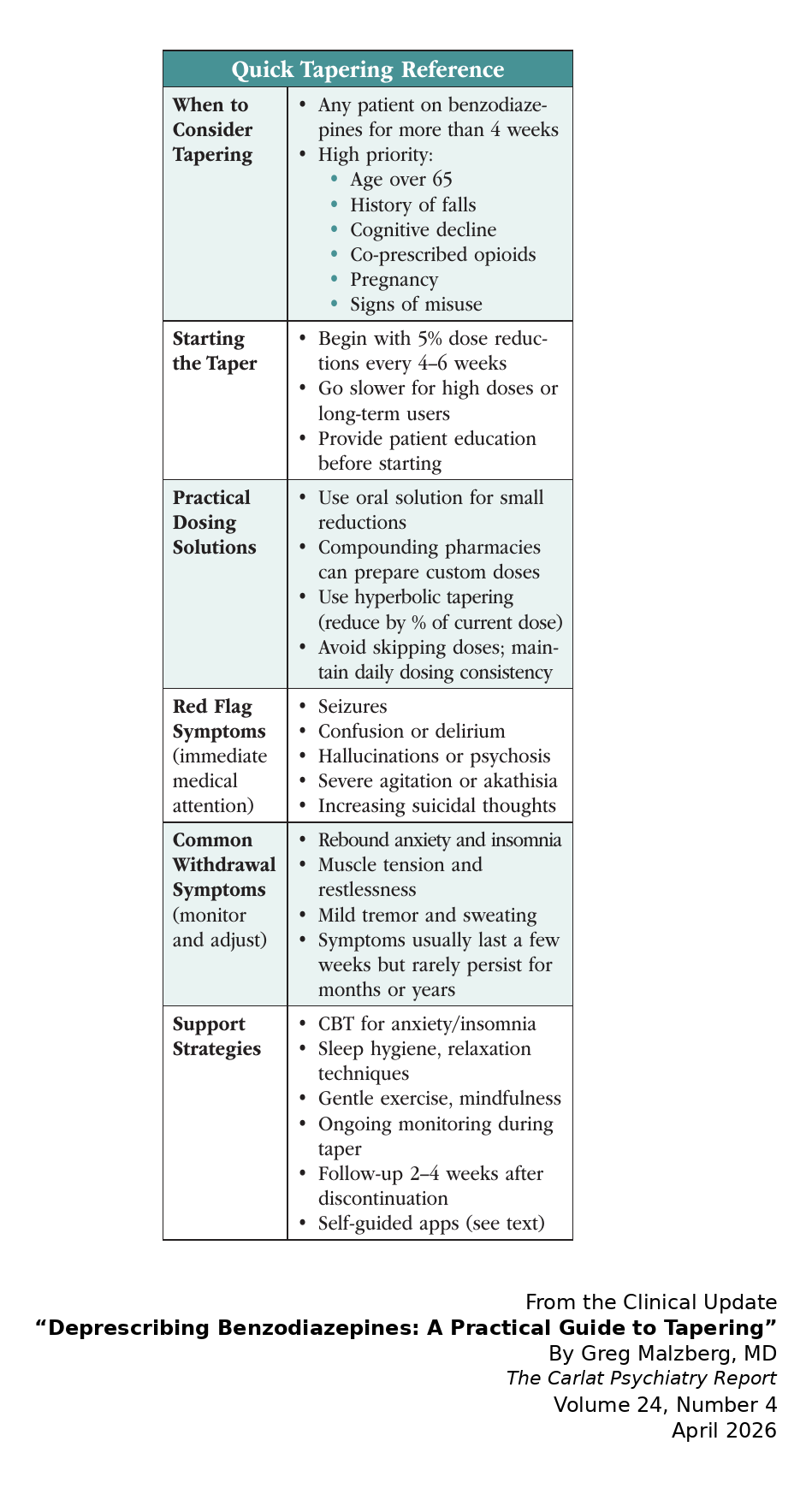 Thorough education sets the stage for successful tapering. Explain to your patient why you’re recommending this approach, reviewing long-term risks and potential benefits like improved cognition, better mood, and reduced fall risk. Help patients understand that withdrawal symptoms represent physiological adaptation, not evidence that they fundamentally “need” the medication.